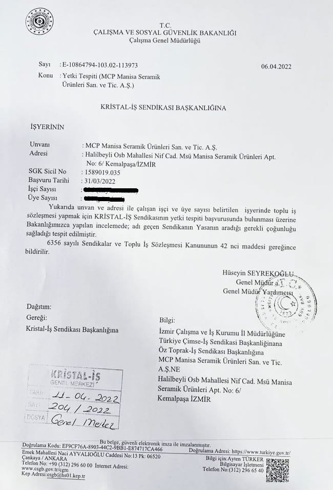 Halilbeyli OSB Mahallesi Nif Caddesi No:6 Bağyurdu, Organize Sanayi Bölgesi 35730 Kemalpaşa/İZMİR adresinde 20.06.2016 tarihinden bu yana faaliyet gösteren MCP Manisa Seramik Ürünleri Sanayi ve Ticaret A.Ş.’ye ait fabrikada 2021 yılının Aralık ayından bu yana sürdürdüğümüz örgütlenmenin sonunda sendikamız toplu iş sözleşmesi yapmak için Yasa’nın aradığı gerekli çoğunluğu sağladı.