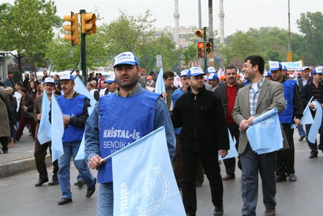 Yine işgalden önceki bir başka eylemde Kristal-İş Sendikası tarihinin dördüncü Şişecam merkezine yürüyüşü gerçekleştirildi. Bu yürüyüşte sadece Topkapı işçileri değil, tüm şubelerden ve diğer sendikalardan da katılımcılar vardı. Kanyon Alışveriş Merkezi önünde toplanan işçiler, eşleri, çocukları ve tüm emek dostları sloganlar eşliğinde Şişecam Genel Müdürlüğü’ne yürüdü. İşveren çok korkmuş olmalı ki binanın önüne geldiğimizde binanın her tarafının polis korumasına alındığını, tomaların hazırda bekletildiğini gördük. Polis çocukların ve kadınların çoğunlukta olduğu gruba gaz sıkmak için hazırda beklerken cam işçisi sağduyusunu korudu. ‘Duyduk ki camdan kuleler ses geçirmezmiş, geçirir mi geçirmez mi görmeye geldik’ diye bağırdı topluluk. Petrol-İş Genel Başkanı Mustafa Öztaşkın ve sendikamız Genel Başkanı Bilal Çetintaş konuşmalarını yaptı. Konuşmalar sık sık işçilerin sloganlarıyla kesildi. Genel başkanımızın konuşmasının sonunda ise ilginç bir olay yaşandı. Direnişçi arkadaşlarımızdan bir tanesinin kızı genel başkanımıza Ahmet Kırman’a vermesi için bir kalem ve tencere uzattı ve şöyle dedi: ‘ Ahmet Kırman soframıza koyduğumuz yemeğimizi elimizden alıyor. Bu yüzden kadınlar adına bu boş tencereyi veriyorum. Benim gibi gençlerin de eğitimine devam etmesini engelliyor. Bu sebeple de bu kalemi veriyorum. Sayın genel başkanım verin bu kalemi Ahmet Kırman’a madem bizleri düşünmüyor, kırsın kalemimizi.’ Genel başkanımız da bu emanetleri Ahmet Kırman’ a vereceğini söyleyerek teslim aldı. Eylemin sonunda gördük ki, ‘camdan kuleler ses geçirirmiş’. İş kuleler eylemi hem kulelerin içerisinde hem de tüm kamuoyunda büyük yankı buldu.