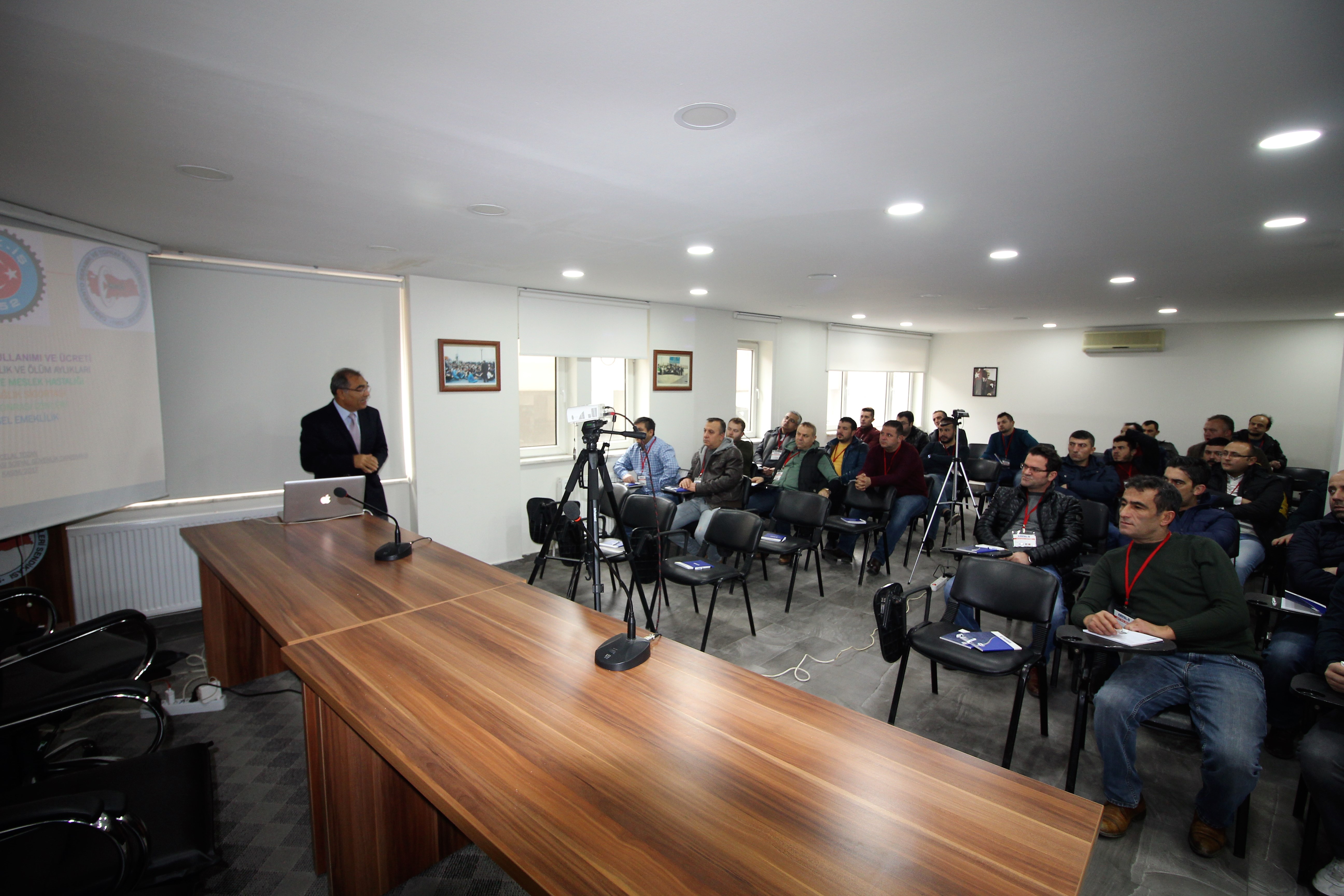 Üye eğitimlerimize sosyal güvenlik uzmanı ve aynı zamanda sosyal güvenlik danışmanımız olan Celal TOZAN ve uzun yıllarını sendikal mücadelelere adayan İstanbul İşçi Sağlığı ve İş Güvenliği Meclisi‘nden Yüksek Kimya Mühendisi Erkan Arslan katıldı. 50 üyemizin katılımı ile gerçekleştirilen eğitimde Erkan Arslan, İş Sağlığı ve Güvenliği Kanunu maddelerine yönelik açıklama ve değerlendirmelerinin yanı sıra ülkemizde yaşanan iş cinayetlerine dair gözlemlerini ve örgütlülük üzerine edindiği deneyimleri üyelerimizle paylaştı. Sosyal güvenlik danışmanımız Celal Tozan, yıllık ücretli izinler, ihbar ve kıdem tazminatı ve bu tazminatlarda zaman aşımı süreleri, genel sağlık sigortası uygulamaları, mazeret izinleri, zorunlu bireysel emeklilik ve iş sağlığı ve güvenliği uygulamalarına ilişkin bir dizi süreç hakkında açıklamalarda bulunurken, sendikamız toplu sözleşme uzmanı Caner Güneş’de 25. Dönem Cam Grup Toplu İş Sözleşmesi, 6356 Sayılı Sendikalar ve Toplu İş Sözleşmesi Kanunu ve grev yasaklarına yönelik değerlendirmelerini üyelerimizle paylaştı.