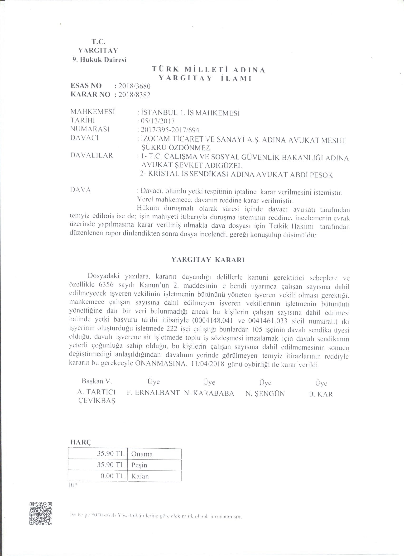 Saint-Gobain grubuna bağlı İzocam fabrikalarında devam etmekte olan toplu iş sözleşmesi yetki sürecinde T.C. Yargıtay 9. Hukuk Dairesi, daha önce yerel mahkemenin sendikamız adına verdiği olumlu yetki tespiti kararını onadı. Kararın Çalışma ve Sosyal Güvenlik Bakanlığı’na tebliğ edilmesinin ardından sendikamız, süreç ile ilgili atılması gereken adımları atacaktır.