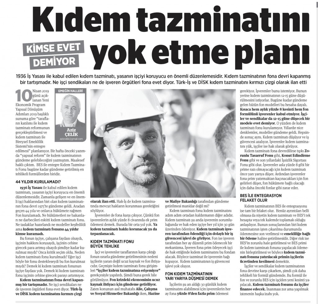 10 Nisan 2019 günü açıklanan Yeni Ekonomik Program Yapısal Dönüşüm Adımları 2019 başlıklı sunuma göre “tarafların katılımı ile kıdem tazminatı reformunun gerçekleştirilmesi ve kıdem tazminatı ile Bireysel Emeklilik Sistemi’nin entegre edilmesi” planlanıyor. Yazının devamı için tıklayınız