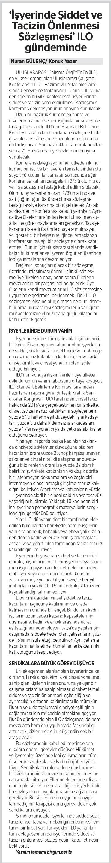 Uluslararası Çalışma Örgütü’nün (ILO) en yüksek organı olan Uluslararası Çalışma Konferansı 10-21 Haziran 2019 tarihleri arasında Cenevre’de toplanıyor. Her yıl haziran ayında toplanan konferans bir yandan yeni çalışma kurallarını kabul ediyor öte yandan ILO sözleşmelerinin uygulanmasını denetliyor. ILO uluslararası alanda çalışma yaşamı için alt standartlar belirleyen üç taraflı (işçi-işveren-devlet) bir örgüt. ILO’nun 100. yılına denk gelen bu yılki konferansta “işyerlerinde şiddet ve tacizin sona erdirilmesi” sözleşmesi konferans delegasyonunun onayına sunulacak. Uzun bir hazırlık sürecinden sonra ve ülkelerden alınan veriler ışığında bir sözleşme taslağı hazırlandı. ILO’nun Standart Belirleme Komitesi tarafından hazırlanan sözleşme taslağı, konferans süresince düzenlenen oturumlarda tartışılacak. Son hazırlıkları tamamlandıktan sonra 21 Haziran’da üye devletlerin onayına sunulacak. Yazının tam metnine ulaşmak için tıklayınız