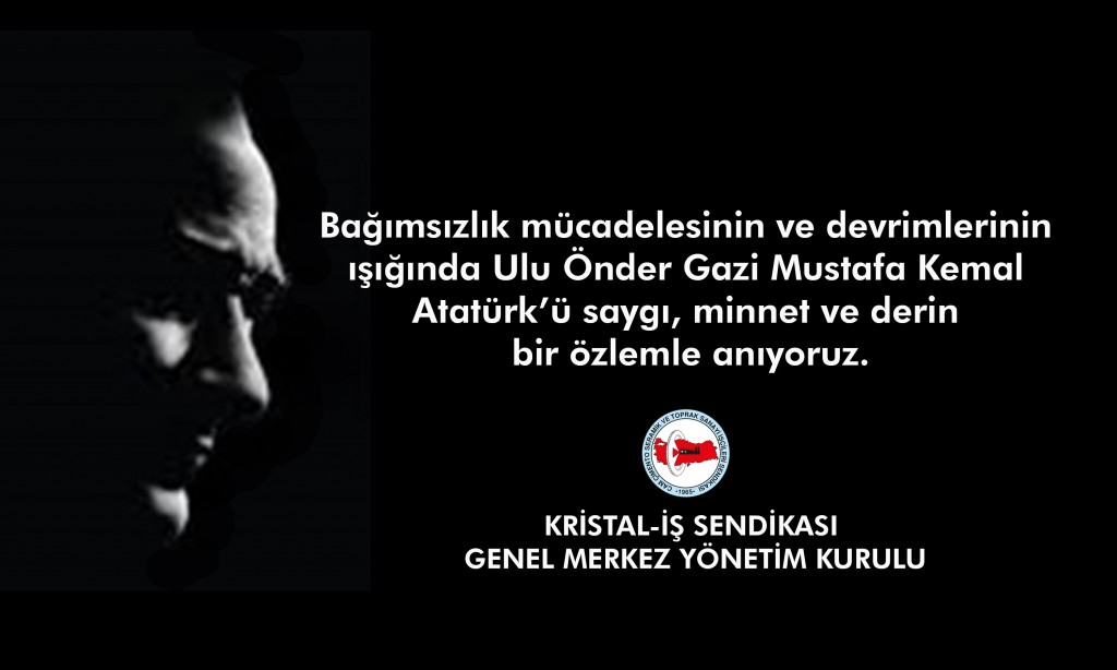 Sendikamız 10 Kasımları sadece Mustafa Kemal Atatürk’ü anma günü olarak değil, O’nun çağdaşlaşma çabalarını ve eserlerini geliştirerek geleceğe taşımaya yönelik kolektif azmimizin yinelendiği bir gün olduğuna inanmaktadır. İşte bu inançla, Büyük Atatürk’e ve onun şahsında dava ve silah arkadaşlarına, Kurtuluş Savaşı’nın tüm kahramanlarına sevgi, saygı ve şükranlarımızı sunuyoruz.