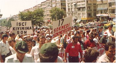 Toprak Seramik İşyerinde Sendikamıza üye olan İşçilerin toplu olarak çıkarılmasına karşı sendikamız 12 Eylül sonrasının ilk İş güvencesi mitingini Bilecik’in Bozüyük ilçesinde gerçekleştirdi. (20 Mart 1987)