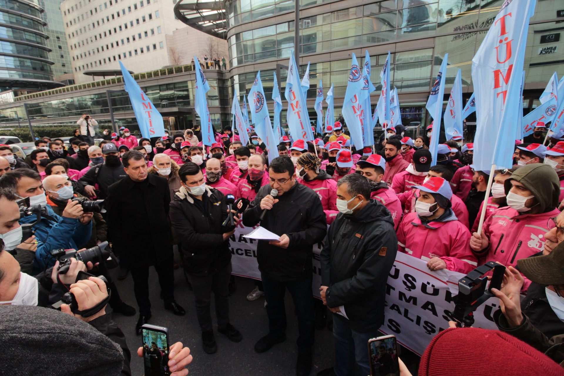Tüm Taşıma İşçileri Sendikası (TÜMTİS) üyesi işçiler sendika hakkı için mücadele ediyor.